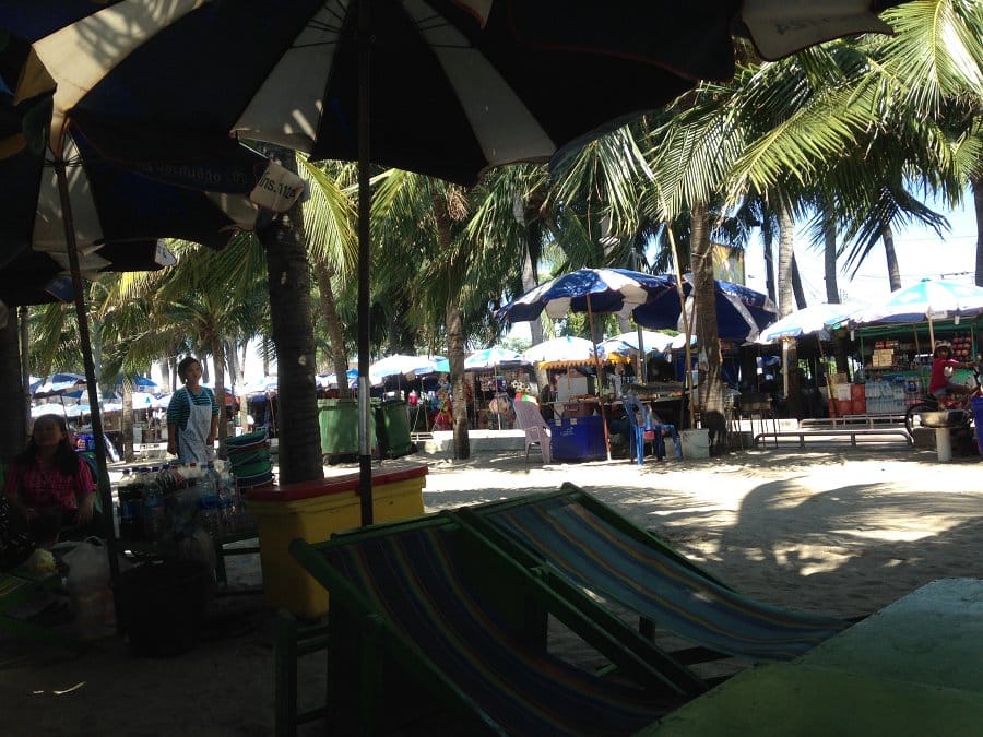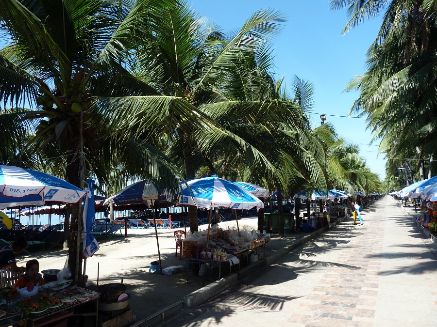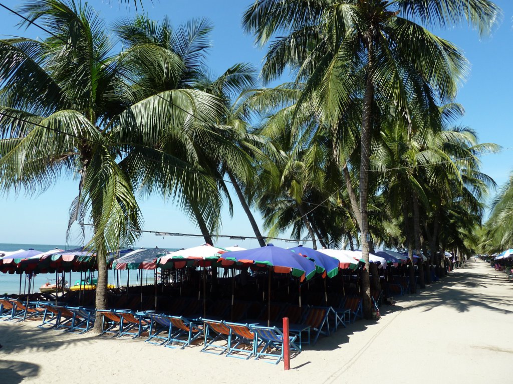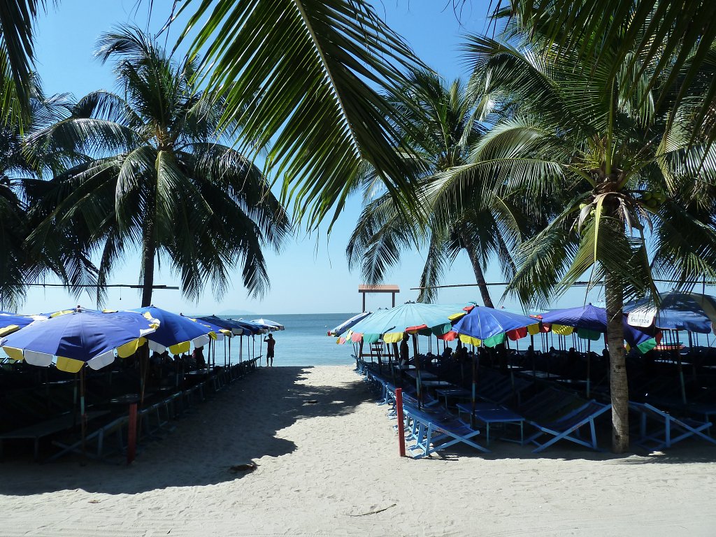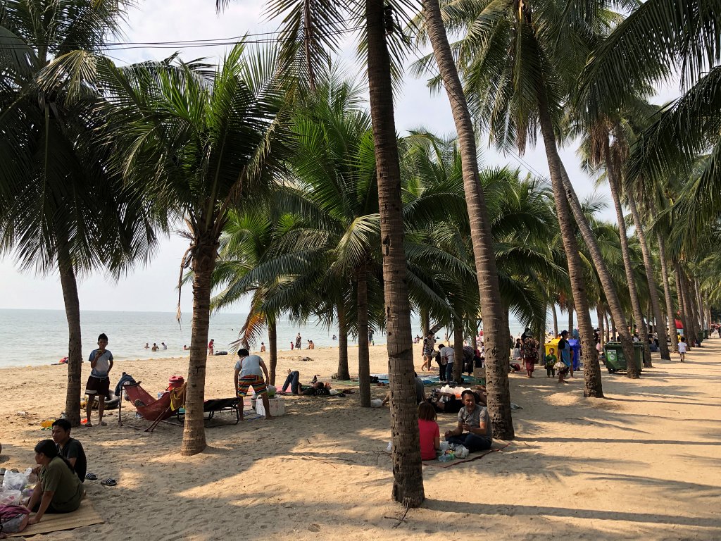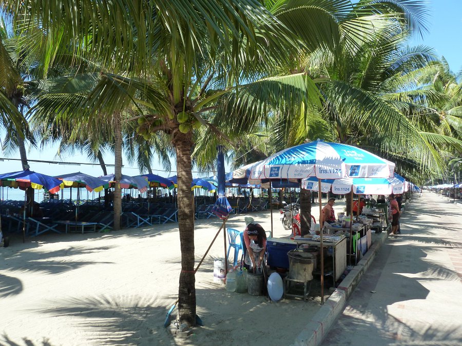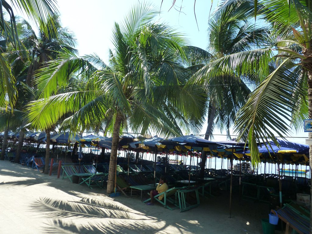 Ein gut zwei Kilometer langer Strand, von Palmen gesäumt und etwa 1,5 Autostunden von Bangkoks Zentrum entfernt. Hier kann man das typische thailändische Strandleben genießen. Dazu gehört keine Sonne, man will ja weiß bleiben oder werden. Deshalb sind die Sonnenschirme hier so nah aneinandergestellt, dass man zu hundert Prozent im Schatten sitzen kann.