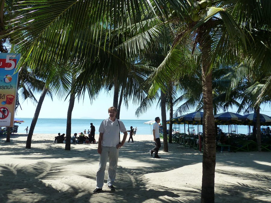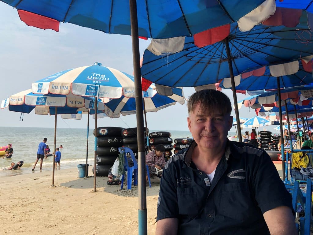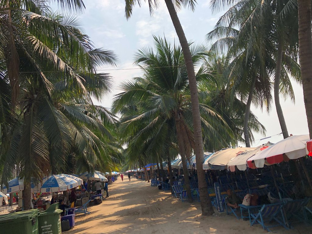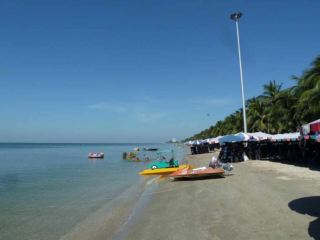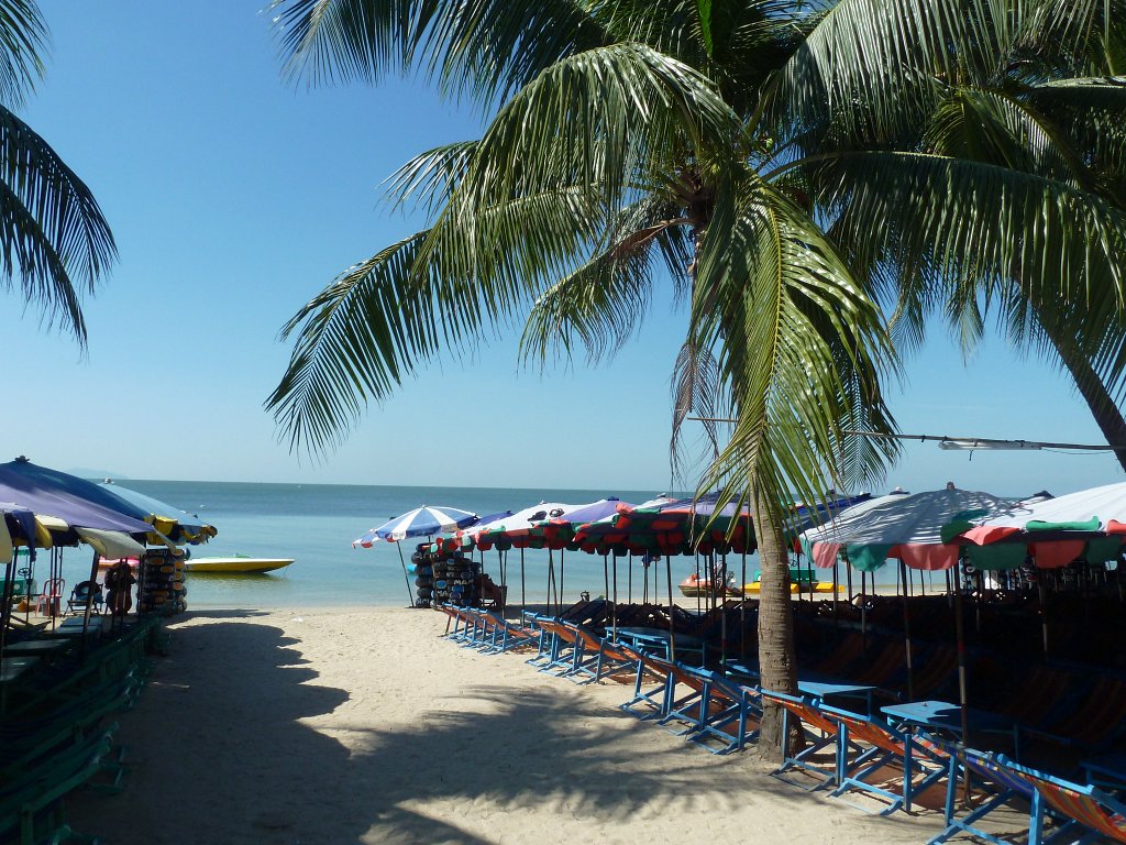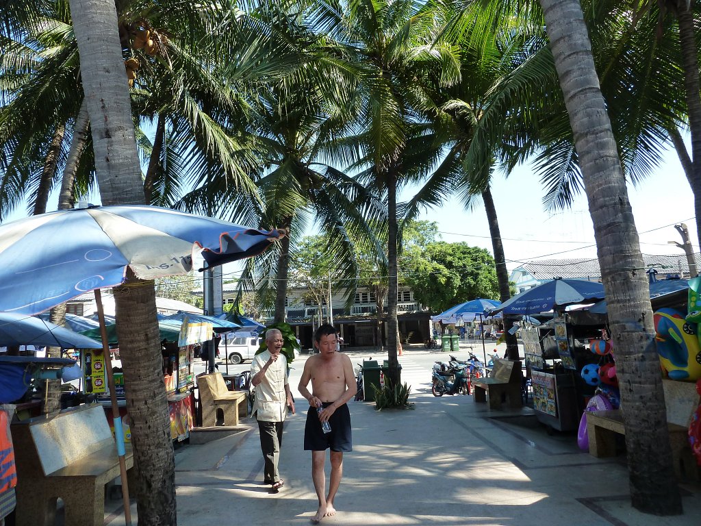 Ein gut zwei Kilometer langer Strand, von Palmen gesäumt und etwa 1,5 Autostunden von Bangkoks Zentrum entfernt. Hier kann man das typische thailändische Strandleben genießen. Dazu gehört keine Sonne, man will ja weiß bleiben oder werden. Deshalb sind die Sonnenschirme hier so nah aneinandergestellt, dass man zu hundert Prozent im Schatten sitzen kann.