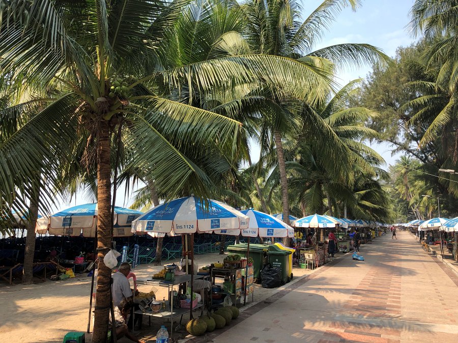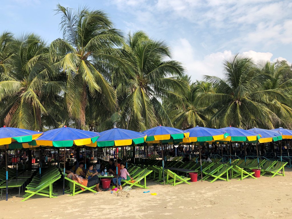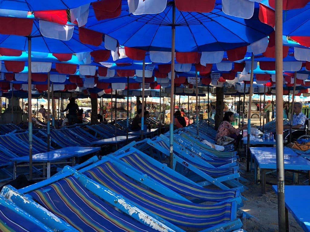 Die Strandstühle muss man mieten, und je näher am Wasser, desto mehr kosten diese. Man kann Getränke und diverse Speisen bestellen. Die werden dann von unterschiedlichen Garküchen geliefert und man bezahlt beim Erhalt. Ebenso gibt es Eimer mit Eiswürfel und Bier und Softdrinks.