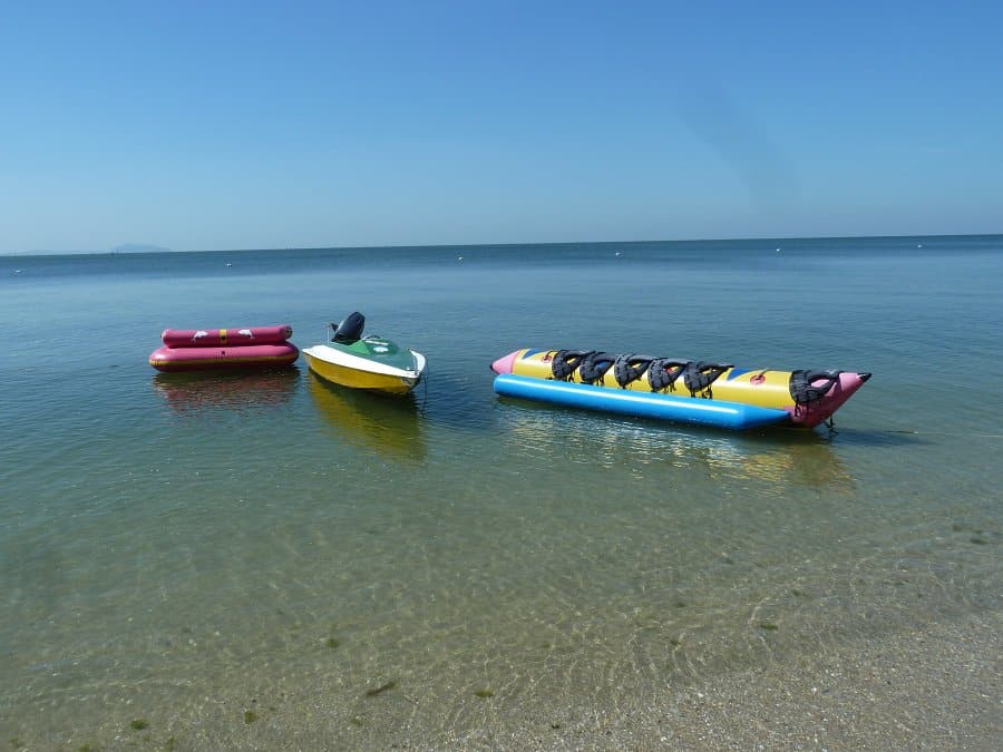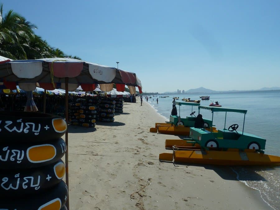 Sanuk muss natürlich auch sein. Die Thais lieben es Spaß zu haben. Bananenboot, aufgeblasene Autoreifen und lustiges Treiben im Wasser inklusive ausgiebiger Fotosession gehören ebenfalls zu einem Thai-Strand-Tag. Man kann Fahrräder mieten und im 4-er-Tandem spazieren fahren. Auf der gegenüberliegenden Seite der Straße gibt es Cafes und Toiletten-(Geschäfte). Für 5 Baht kann man sich erleichtern und hat einigermaßen saubere sanitäre Anlagen. Also alles bestens organisiert.