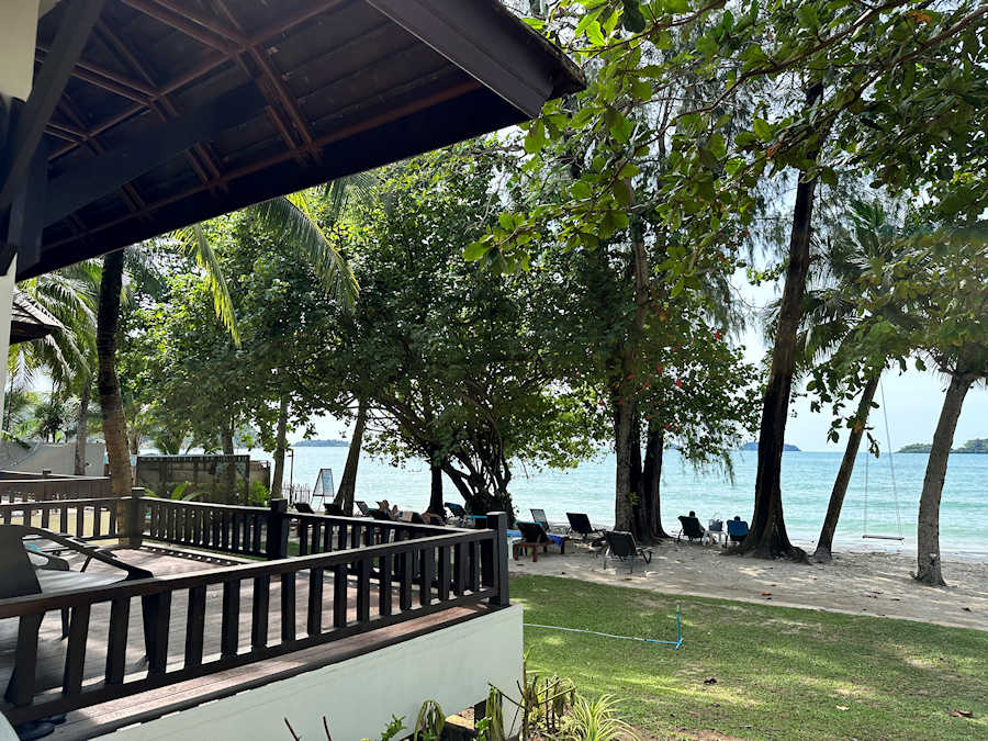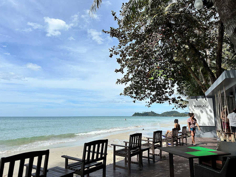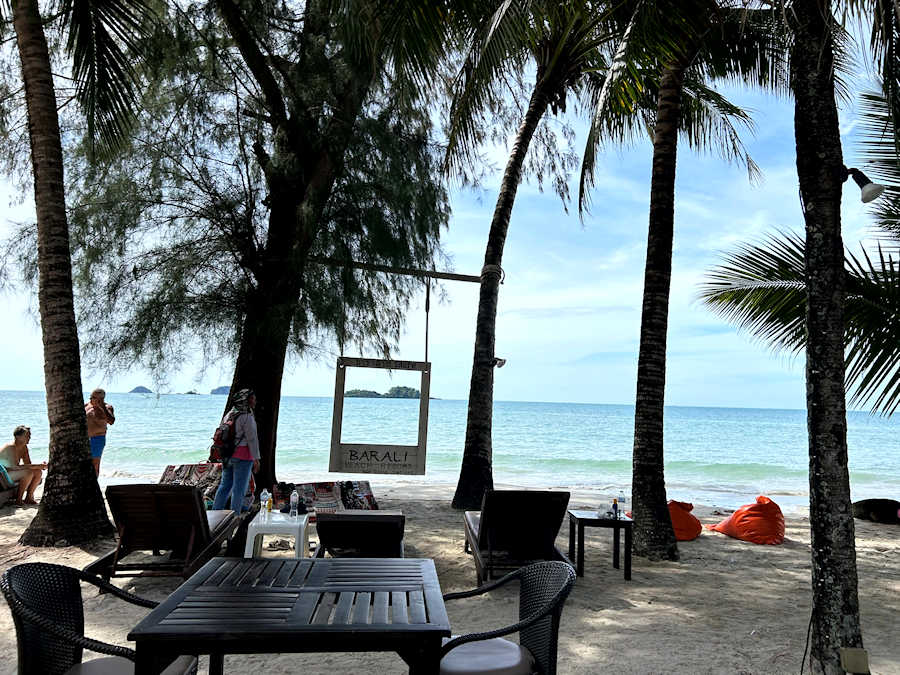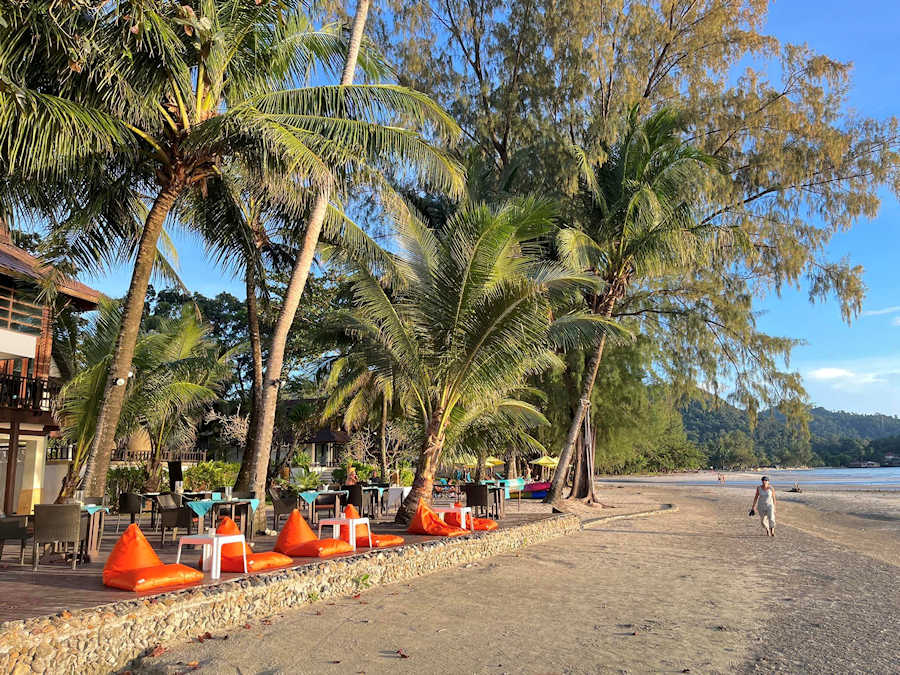 Wir setzen uns in die Beach Bar ganz vorne beim Strand und genießen das Ambiente und den freundlichen Service. Das Resort liegt ruhig und etwas abseits der Inselstraße, die man in etwa 10 Gehminuten erreichen kann. Dort gib es weitere Restaurants, eine Pizzeria, Geschäfts, Cafés und Massagesalons.
