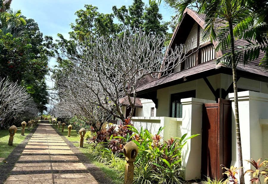 Der süße Duft blühender Franchipani-Bäumchen liegt wie ein zarter Schleier über dem Weg zum Strand. Links und rechts davon befinden sich die hübschen Deluxe Villen. Und dann zeigt sich das hellblaue Meer am wunderschönen Sandstrand. Palmen und Casuarinen spenden Schatten.