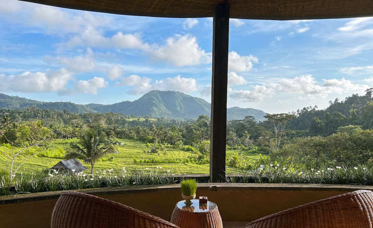 So eine idyllische Oase. Etwas oberhalb eines Flusstals liegt dieses hübsche Boutique-Hotel. Wapa ist der Name des Besitzers und “di Ume” bedeuten so viel wie inmitten der Reisfelder. Vom Infinity-Pool genießt man den herrlichen Blick auf die Natur. Auf der einen Seite das sich weitende Tal mit den Reisfeldern, auf der anderen der hoch aufragende grün bewachsene Berg.