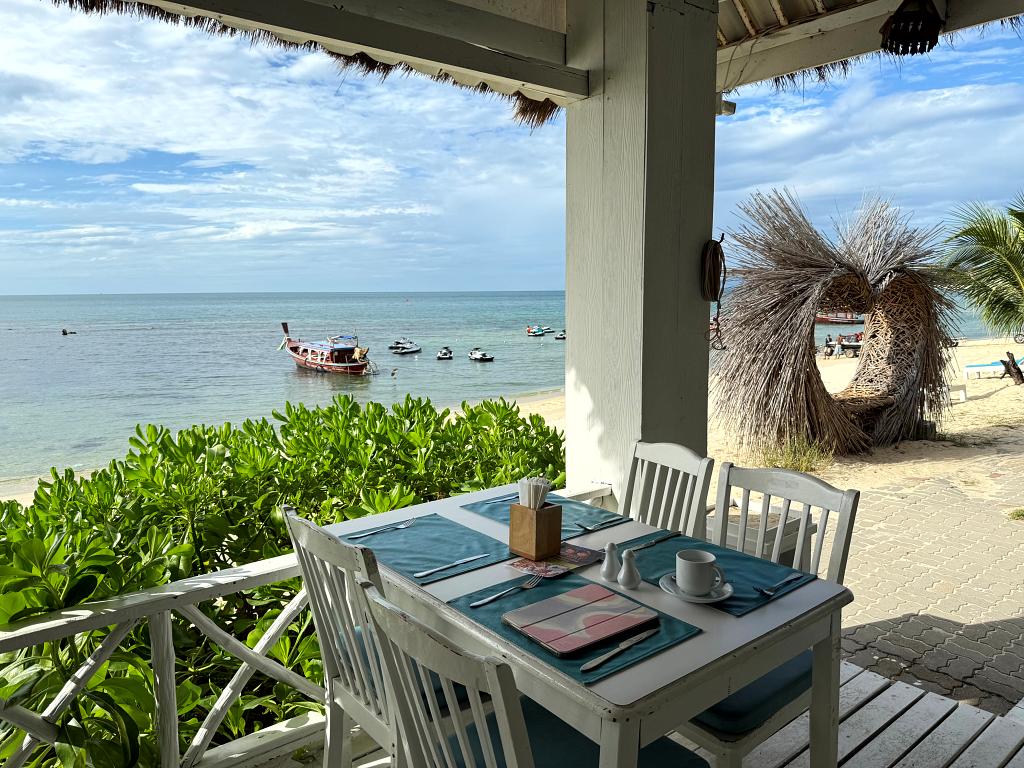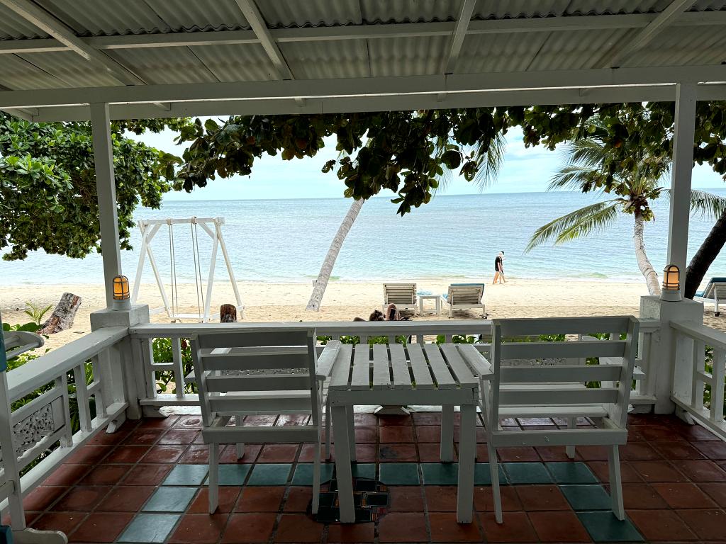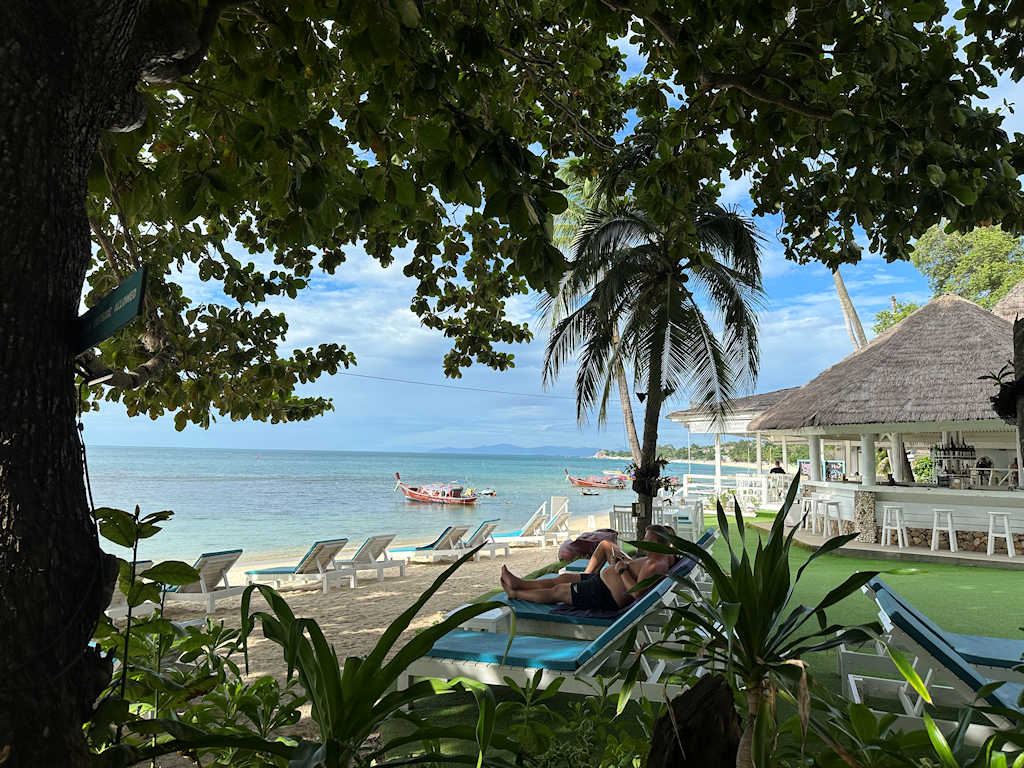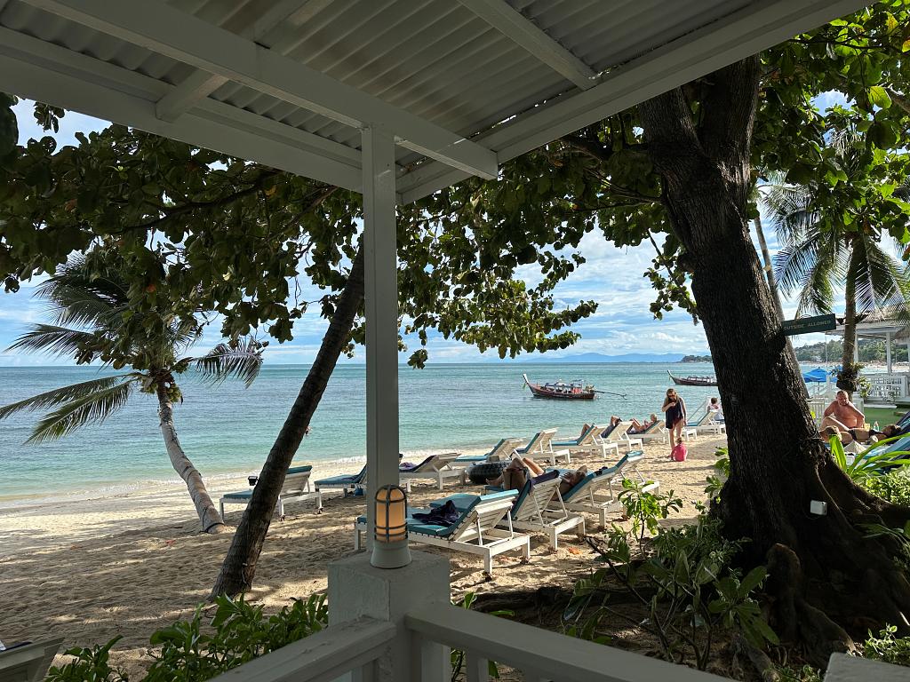 Was sagen Sie dazu? Ist dieser Ausblick von meinem Beachfront Bungalow nicht traumhaft schön? Ein Bungalow direkt am Strand. Unter einem großen Schatten spendendem Baum. Der herrliche Lamai Beach auf Koh Samui zu ihren Füßen.